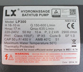 La bomba LX Whirlpool LP300 de 3 HP es el componente de máxima potencia dentro de la serie LP, diseñada específicamente para alimentar circuitos de hidromasaje de alto rendimiento en spas de gran volumen o con un elevado número de jets. Este motor de una sola velocidad destaca por su impresionante capacidad de mover grandes caudales de agua. Fabricada con materiales termoplásticos de alta resistencia y un motor con protección térmica Clase F, la LP300 es la solución definitiva para quienes buscan durabilidad extrema y un rendimiento hidráulico superior en configuraciones de spa premium que exigen el máximo flujo posible.