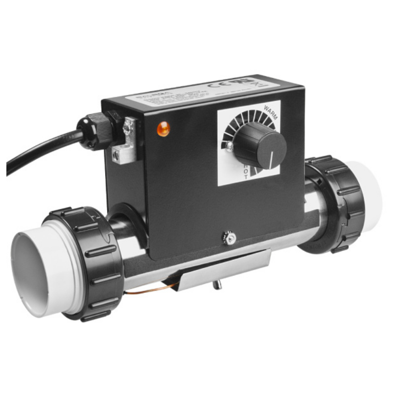El Calentador Balboa «Vacuum» de 1.5 kW  es una unidad robusta diseñada para bañeras de hidromasaje que requieren una instalación en el circuito de succión. Su característica principal es la integración de un termostato analógico ajustable, que permite al usuario predefinir la temperatura deseada directamente en el equipo.