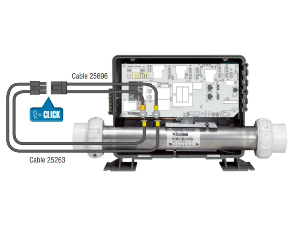 El calentador Balboa M7 de 3 kW está cableado con una toma Plug N’Click que se conecta directamente a la placa base de muchos sistemas de control Balboa BP, incluidos el BP600, el BP6013G1, el BP6013G2, el BP6013G3 y el BP2100. Para conectar este calefactor a otros modelos de sistema de control Balboa (incluidos el BP200 G1 y el UX), necesitará un adaptador 5052 aparte.