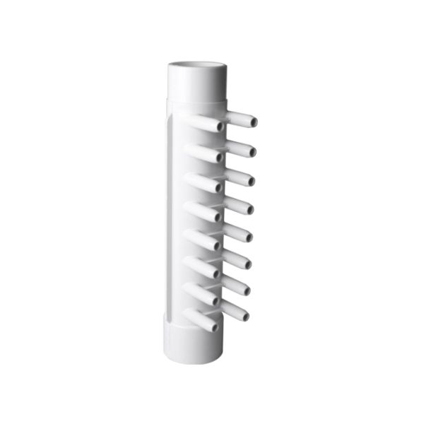 Este distribuidor de 1.5 «de ABS permite conectar los tubos de las bombas a los de los jets de agua o de aire. Tiene una entrada macho de 1,5″ y una entrada hembra de 1,5″, y dieciséis salidas lisas hacia los jets para tubos de 3/8».