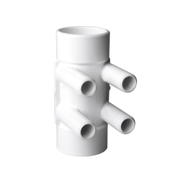 Este distribuidor de ABS permite conectar los tubos de las bombas a los de los jets de agua o de aire. Tiene una entrada macho de 2″ y una entrada hembra de 2″, y cuatro salidas lisas hacia los jets para tubos de 3/4″ flexibles.