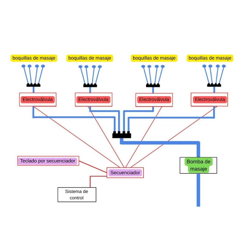 Se trata de un controlador auxiliar que abre y cierra el suministro de agua de las cuatro electroválvulas (como mínimo) a los grupos de jets estratégicamente instaladas en el spa para obtener la secuencia de hidromasaje deseada.