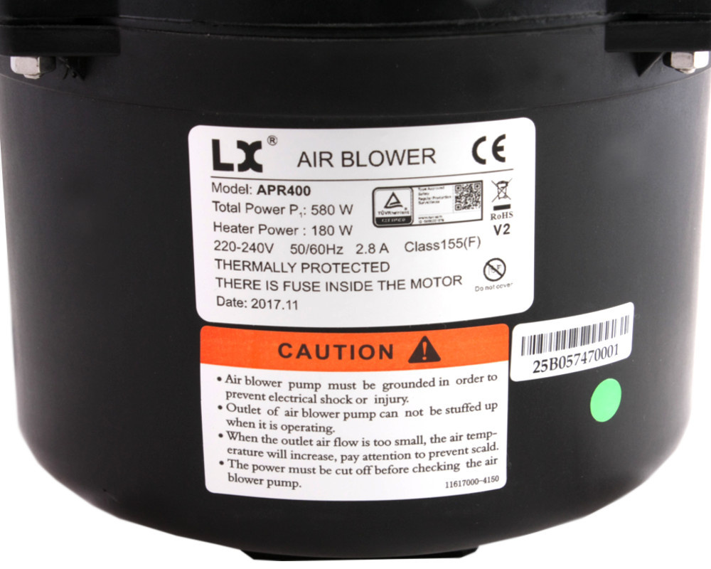 Este soplador de aire (blower) LX Whirlpool APR400-V2 de 400 W está equipado con un elemento calefactor de 180 W más. La caja está hecha de plástico técnico altamente reforzado y resistente a altas temperaturas. Lleva un fusible y una sonda de sobrecalentamiento integrados.