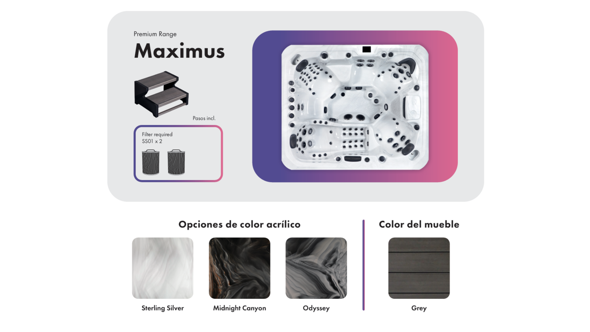 El Spa Maximus es el más grande y uno de los más potentes de la gama Premium. Su carcasa acrílica Aristech está disponible en 3 colores: Sterling Silver, Midnight Canyon y Odyssey. El Spa Maximus se beneficia de todas las características de la gama Premium, incluyendo un Sistema de sonido Bluetooth integrado y iluminación LED de alta calidad integrados en los paneles de las esquinas, así como iluminación subacuática por inundación e iluminación de la línea de flotación.
