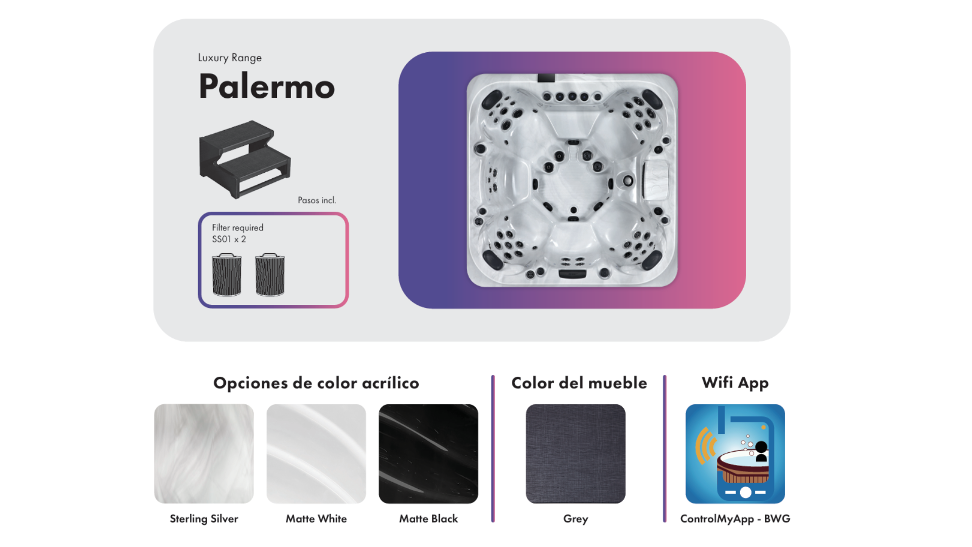 Ofrece la posibilidad de controlar el spa mediante una aplicación WiFi. Gestionar su spa ahora es mas fácil. Control de chorros, iluminación