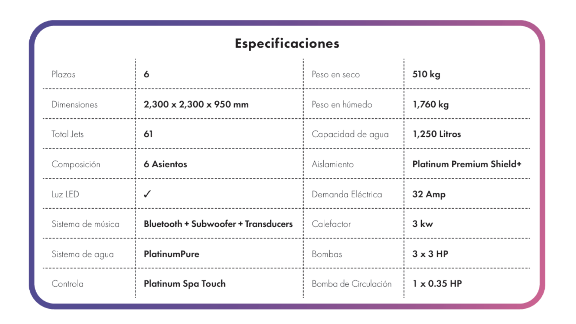 Desarrollado por tres bombas de alto rendimiento de 3 CV. Con 61 chorros de precisión ofrecen una amplia gama de experiencias hidroterapéuticas, desde el masaje rotatorio profundo hasta el flujo direccional suave. Tanto si necesita un alivio muscular vigorizante como una relajación corporal completa, cada asiento le ofrece algo único.