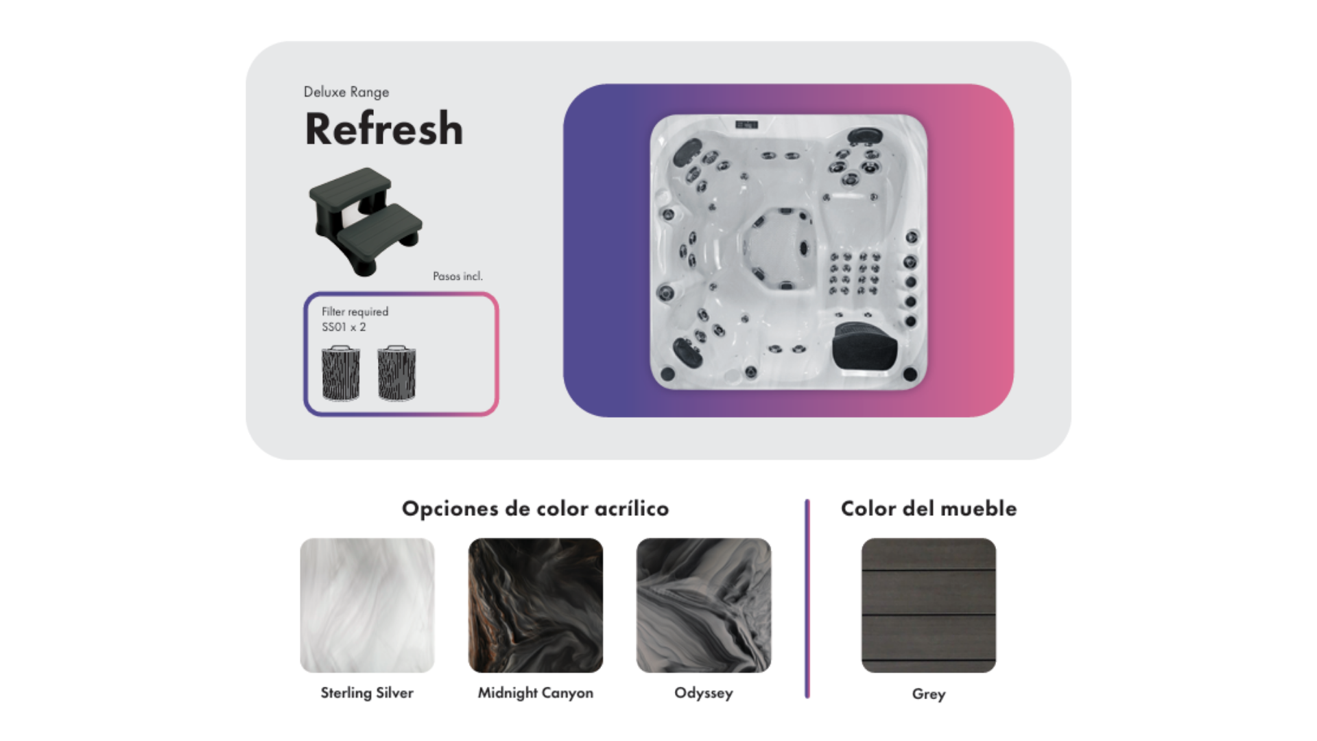 El modelo Refresh hace honor a su nombre: ha sido diseñado para revitalizar tus sentidos y ofrecerte un escape del estrés cotidiano sin salir de casa. Este jacuzzi combina la durabilidad de los materiales premium con un sistema de hidroterapia altamente eficiente.