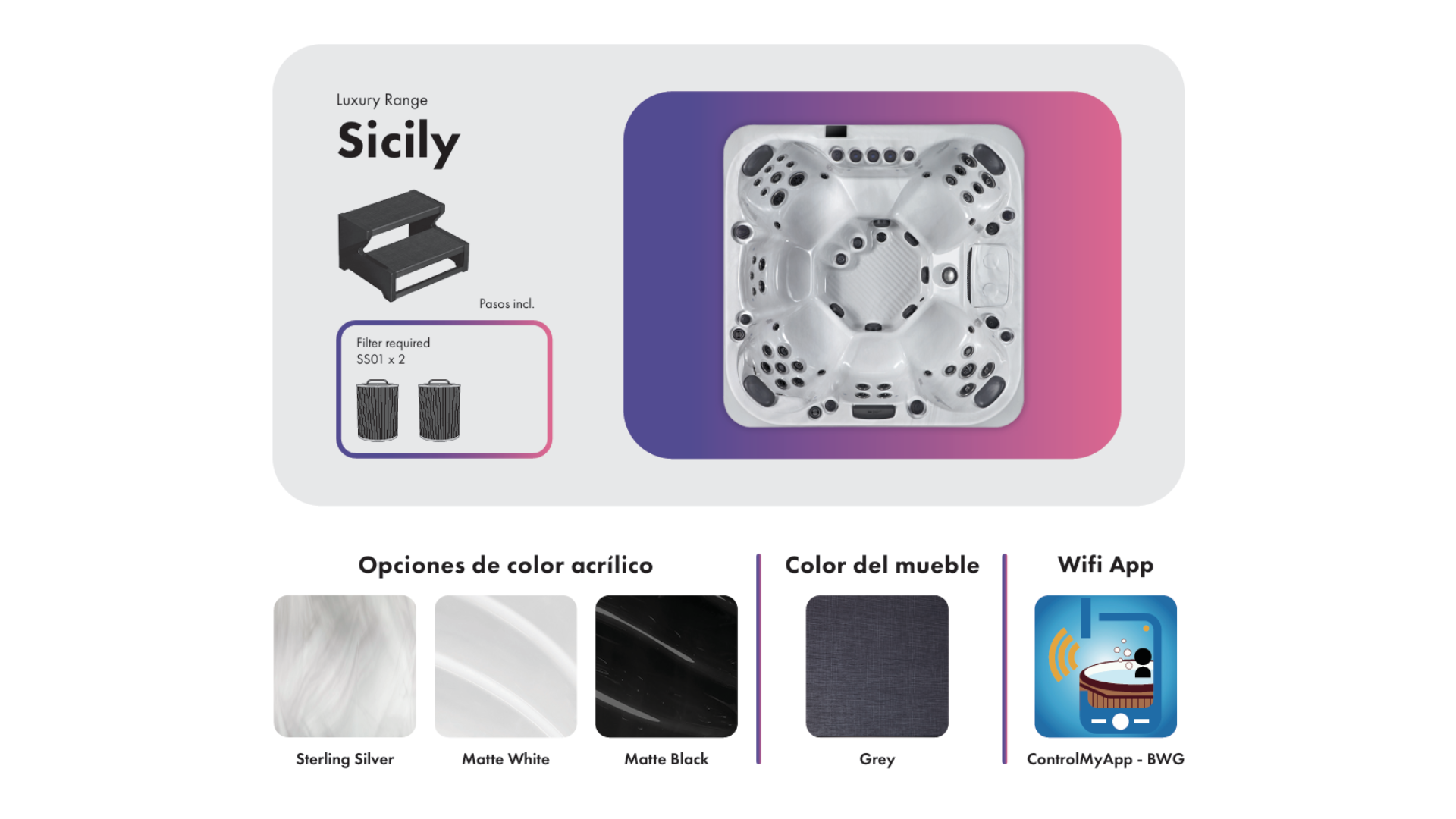 Ofrece la posibilidad de controlar el spa mediante una aplicación WiFi. Gestionar su spa ahora es mas fácil. Control de chorros, iluminación