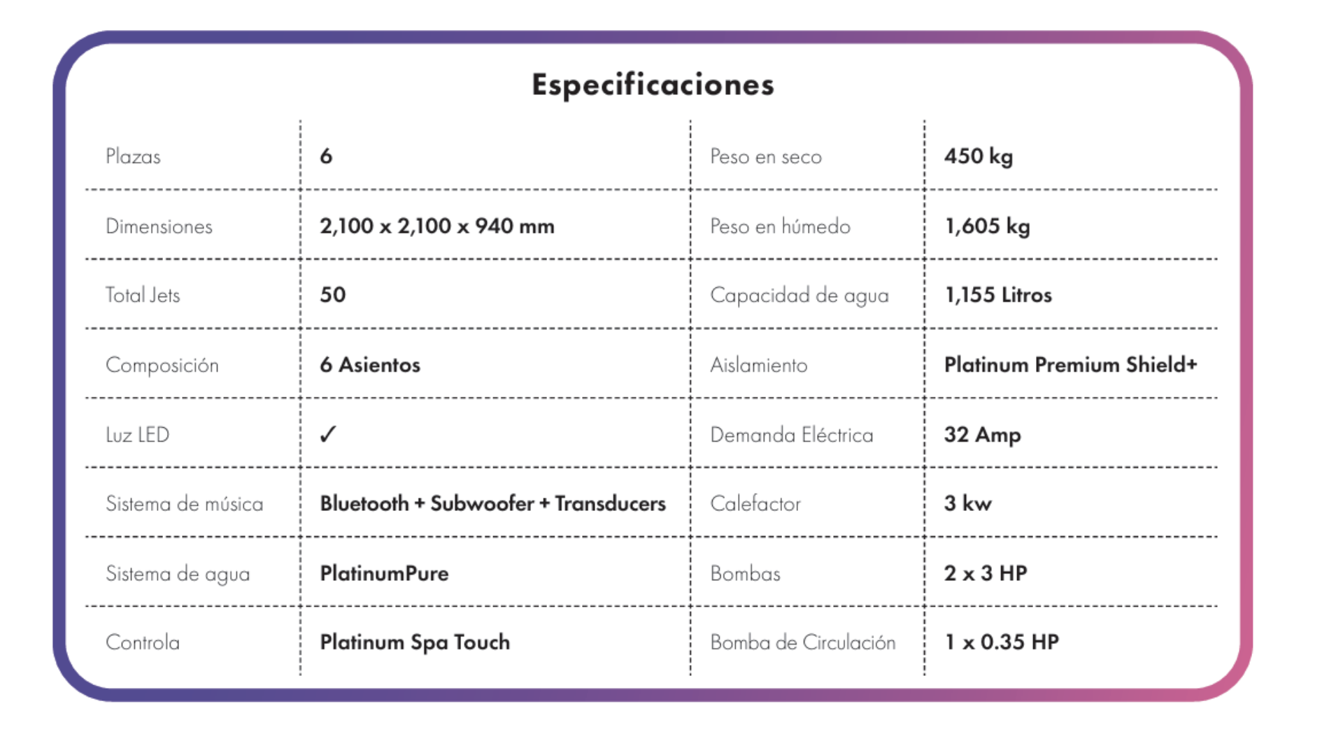 - PlatinumPure™ Pureza cuádruple. El desinfectante UV, el sistema de ozono, la cámara de mezcla de ozono y el ionizador mineral mantienen el agua cristalina con un mínimo de productos químicos.