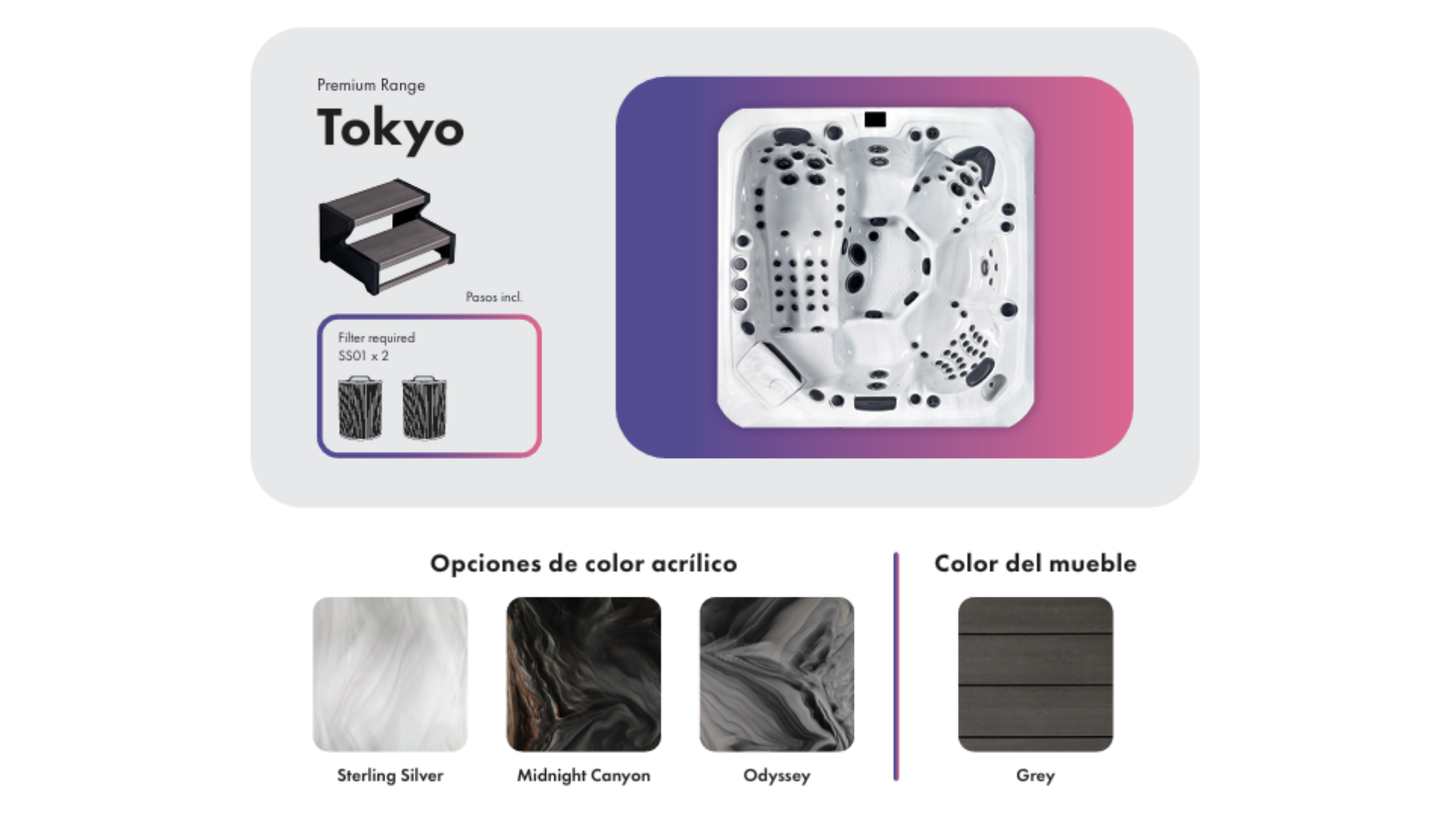 Disponible en Plata de ley, Cañón de Medianoche o Odyssey. El spa Tokyo, con acabados acrílicos, combina su elegante carcasa con paneles laterales grises de primera calidad. El resultado es un spa que tiene tan buen aspecto como tacto: elegante, moderno y fabricado para durar.