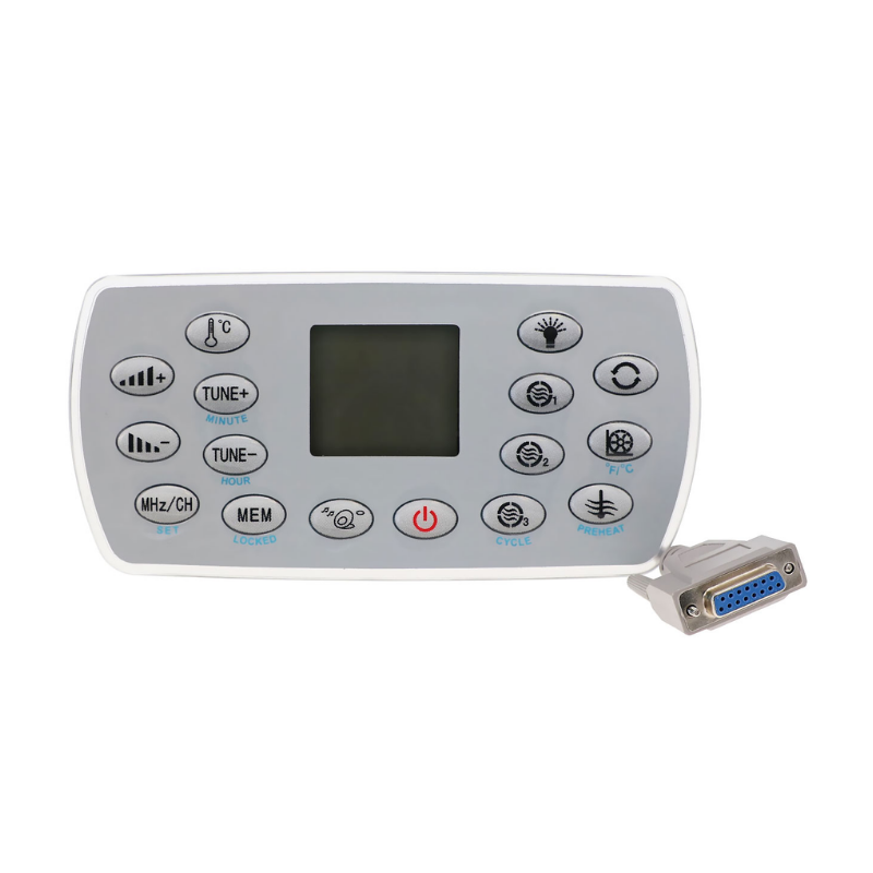 El Ethink KL8-3H es un panel de control digital de alto rendimiento para spas y jacuzzis, diseñado para gestionar sistemas de hasta tres bombas de hidromasaje. Cuenta con una pantalla LCD retroiluminada de fácil lectura y una interfaz de 10 botones que permite el control total de la temperatura, iluminación, filtrado y funciones de radio/CD integradas.