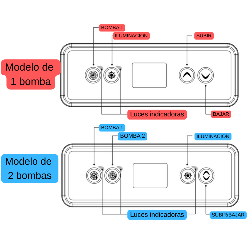 2 bombas: Jet 1, Jet 2, Iluminación, Temperatura