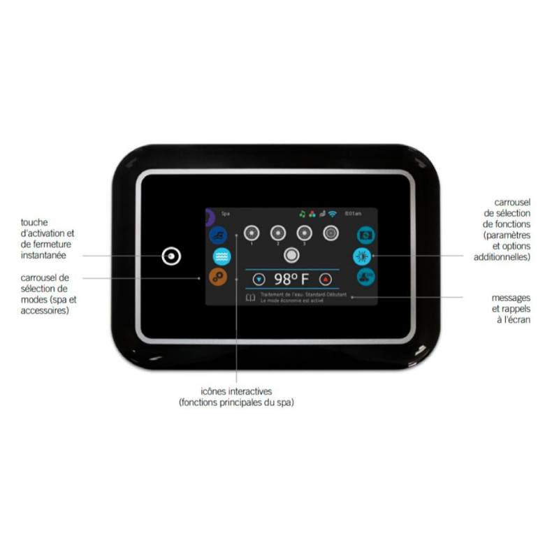 A diferencia de su predecesor, la versión «+» cuenta con un procesador más potente que garantiza una respuesta táctil instantánea y una navegación fluida por menús iconográficos intuitivos. Su diseño elegante y extraplano se integra perfectamente en el acrílico del spa, con resistencia total al agua.